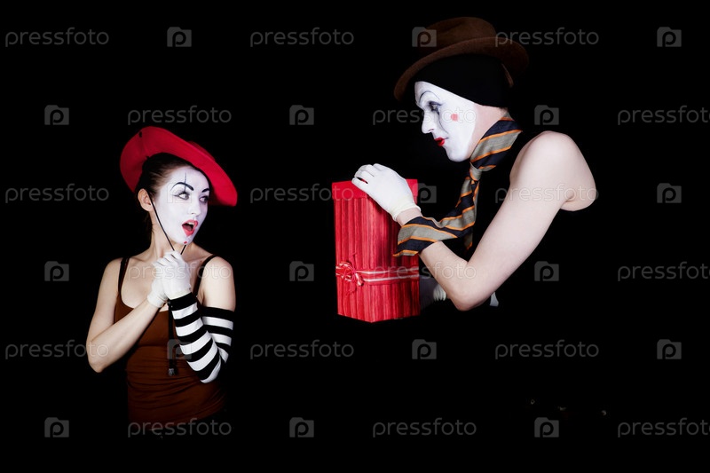 Мужчина-мим дает женщине подарок в красной коробке