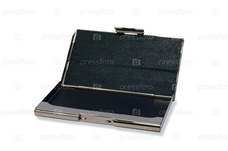 Открывается держатель для визитных карточек из стали. Черная внутренняя поверхность. Изолировано над белым, с дорожкой обрезки