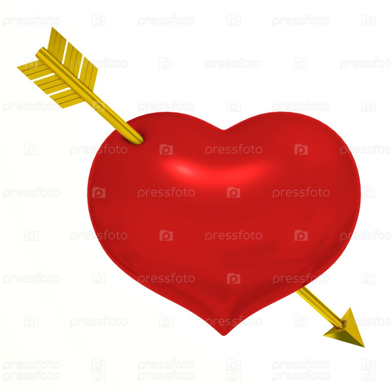Красное сердце, пронзенное золотой стрелой на белом фоне