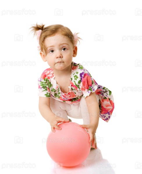 Серьезная маленькая девочка в платье с мячиком на белом фоне