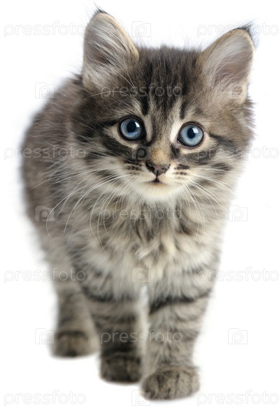 Маленький серый котенок на белом фоне