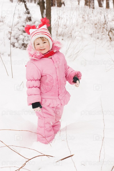 Маленькая девочка в розовом комбинезоне стоит на снегу на улице
