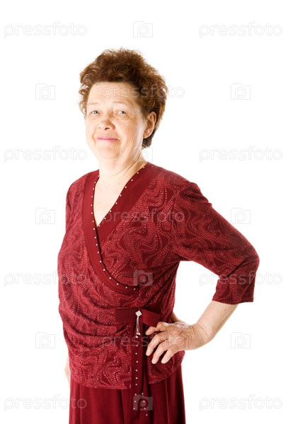 Улыбающаяся пожилая женщина в красном платье, изолированная на белом фоне