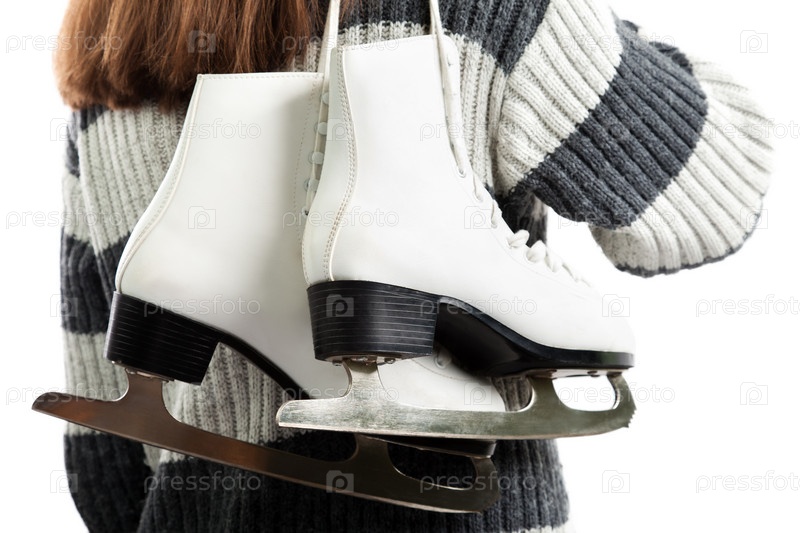 Женщина несет на плече белые фигурные коньки