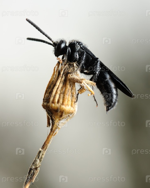 Черная пчела сидит на сухом растении, крупный план, Израиль