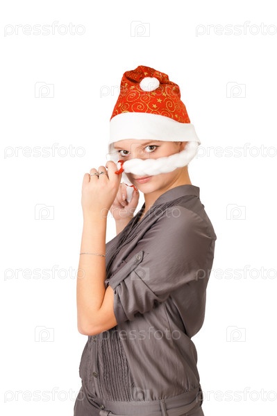 Девушка закрывает лицо косичкой от новогодней шапки