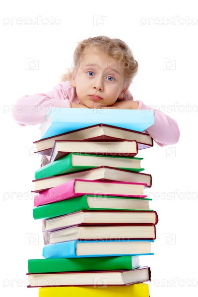 Симпатичная первоклассница обнимает стопку книг, на белом фоне