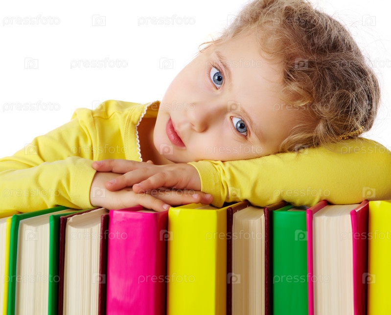 Симпатичная первоклассница лежит на стопке книг, на белом фоне