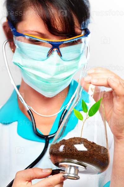 Женщина-ученый исследует растение в стеклянной колбе