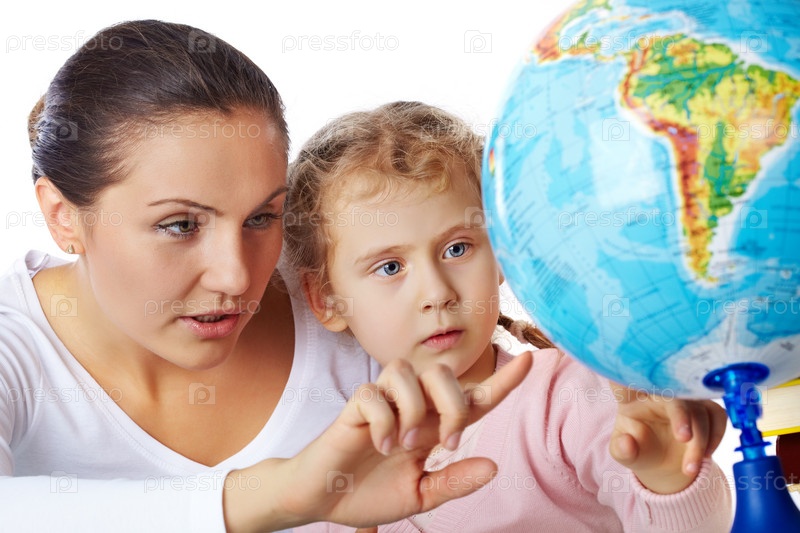 Первоклассница с мамой внимательно изучает глобус, на белом фоне