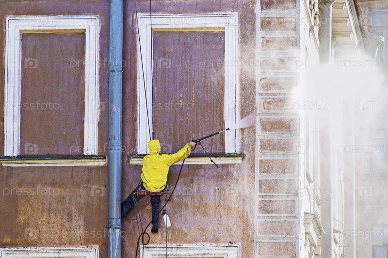 Промальпинист моет старый фасад здания