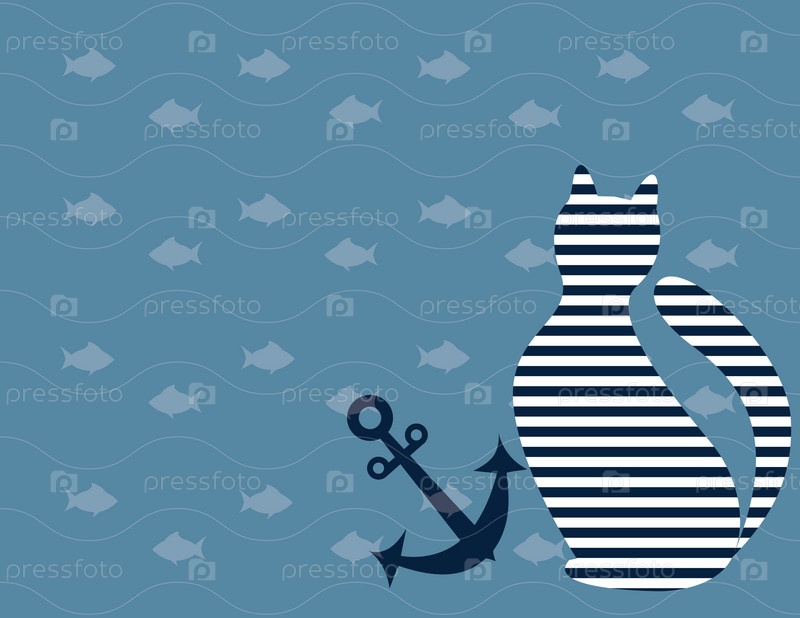 Иллюстрация полосатого кота с якорем на фоне рыбок в море