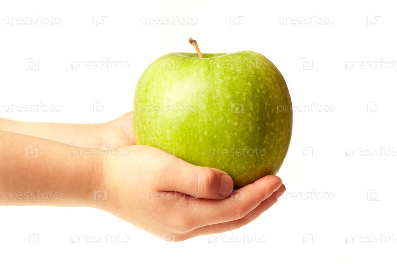 Зеленое спелое яблоко в руках на белом фоне