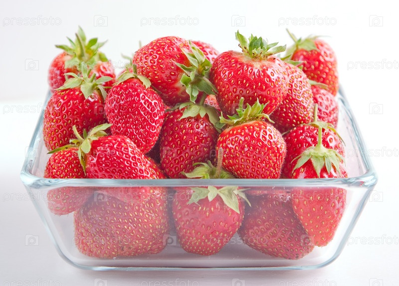 Клубника в стеклянной тарелке на белом фоне