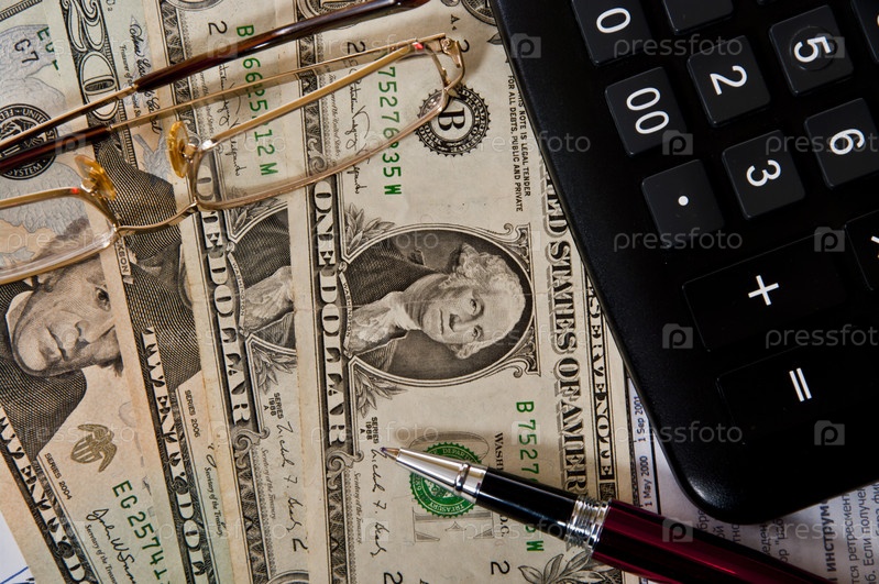 Доллары, калькулятор и ручка на фоне документов