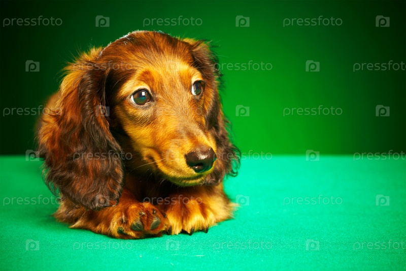Щенок таксы на зеленом фоне