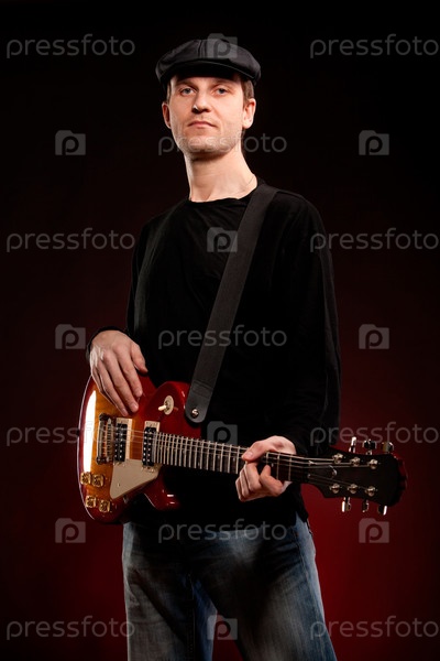 Музыкант с гитарой на темном фоне