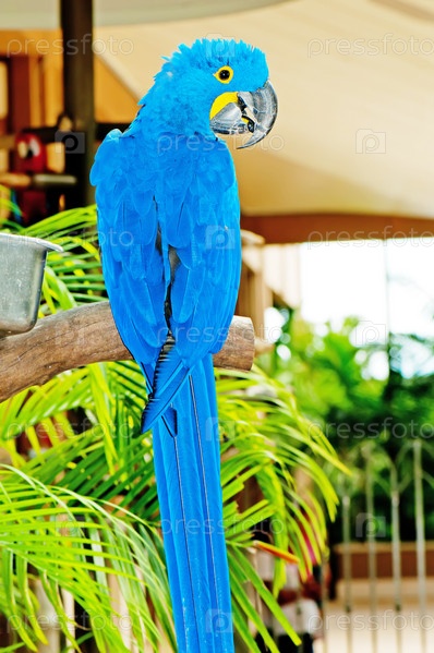 Ярко-голубой попугай сидит на жердочке