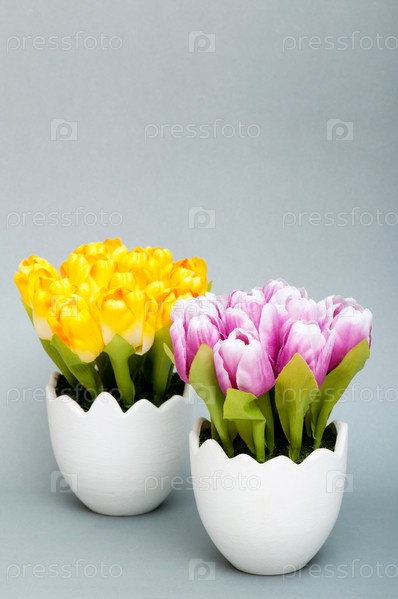 Розовые и желтые тюльпаны в белых горшках