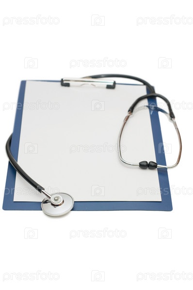 Планшет с листком бумаги и стетоскоп, изолированные на белом фоне