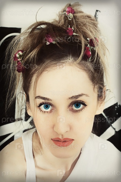 Портрет красивой блондинки с цветами в волосах