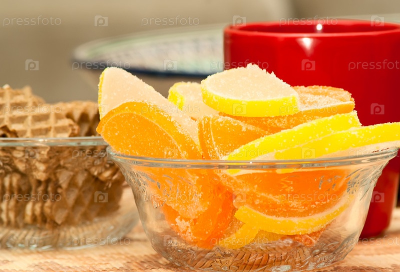 Сладкий стол с кружкой, вафлями и мармеладом в форме цитрусовых долек