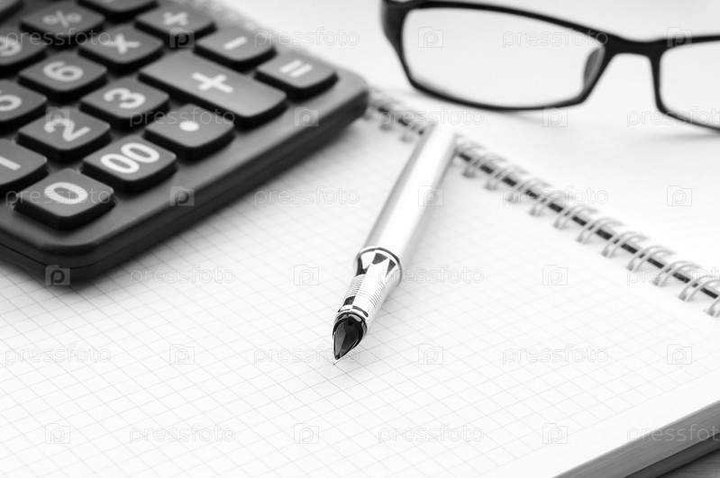 Калькулятор, ручка и очки на открытой тетради в клеточку
