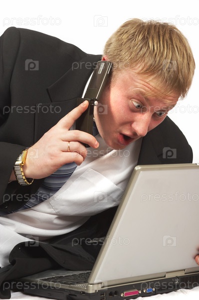 Удивленный бизнесмен с телефоном смотрит в ноутбук