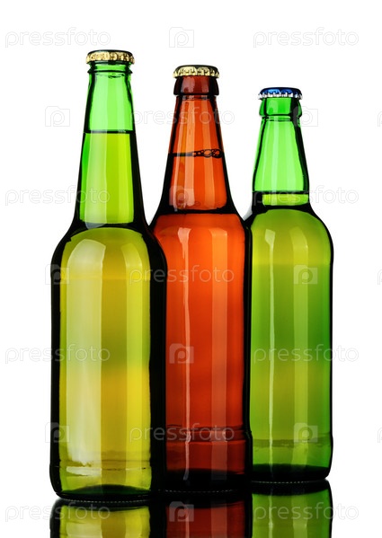 Бутылки из зеленого и коричневого стекла на белом фоне