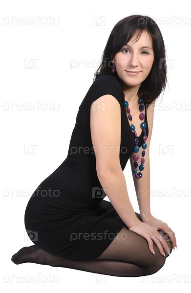 Девушка в черном платье сидит на белом фоне