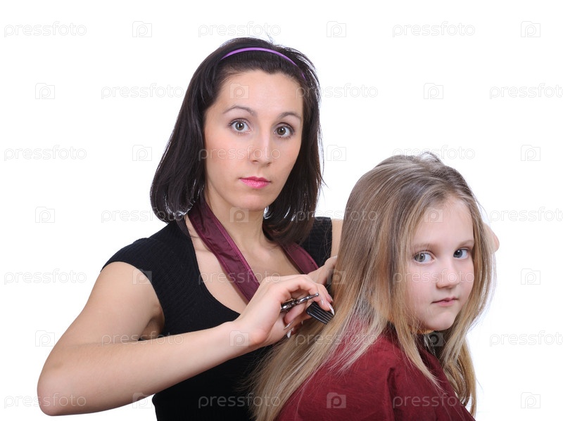 Женщина делает прическу девочке на белом фоне