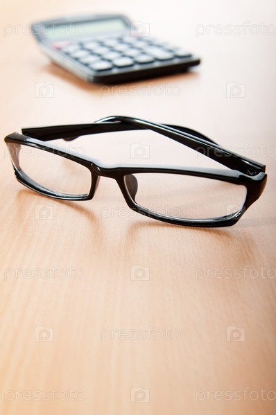 Очки и калькулятор на деревянной поверхности