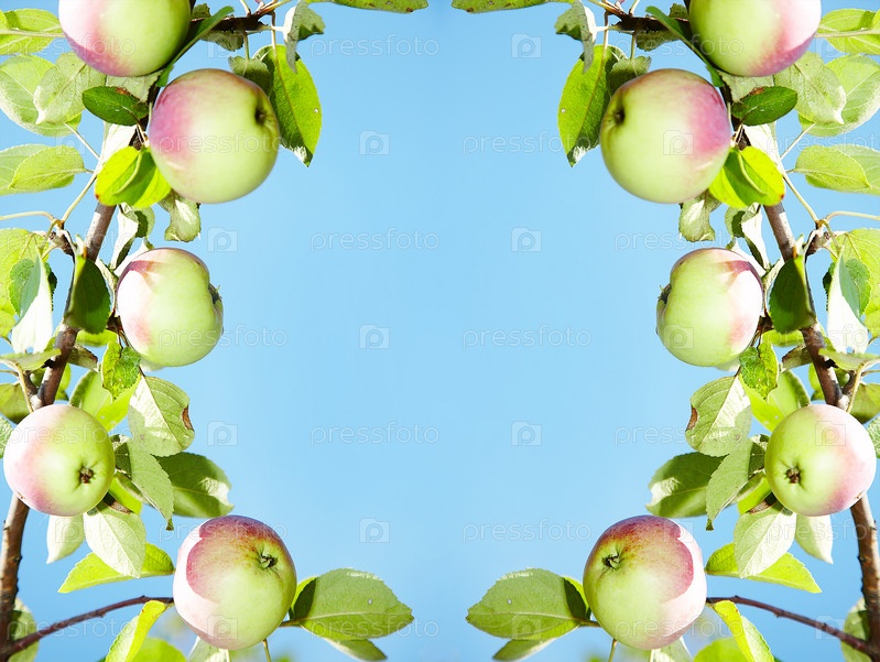 Ветки яблони на фоне голубого неба. Рамка