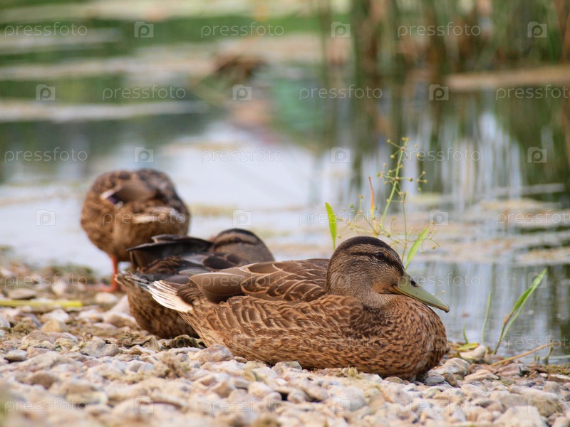 Стая уток на берегу реки