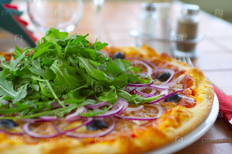 Горячая пицца на столе в кафе