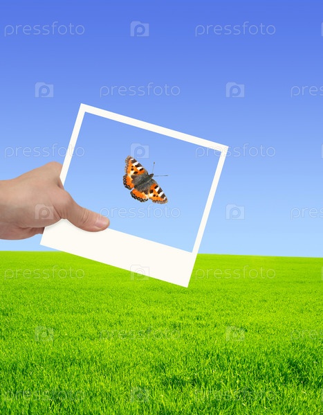 Рука с фотографией на фоне луга