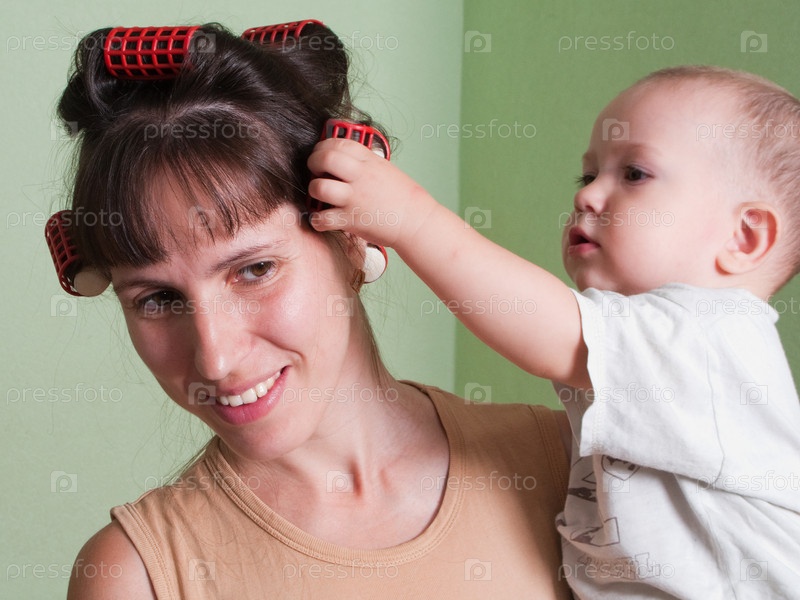 Мама в бигуди с сыном на руках