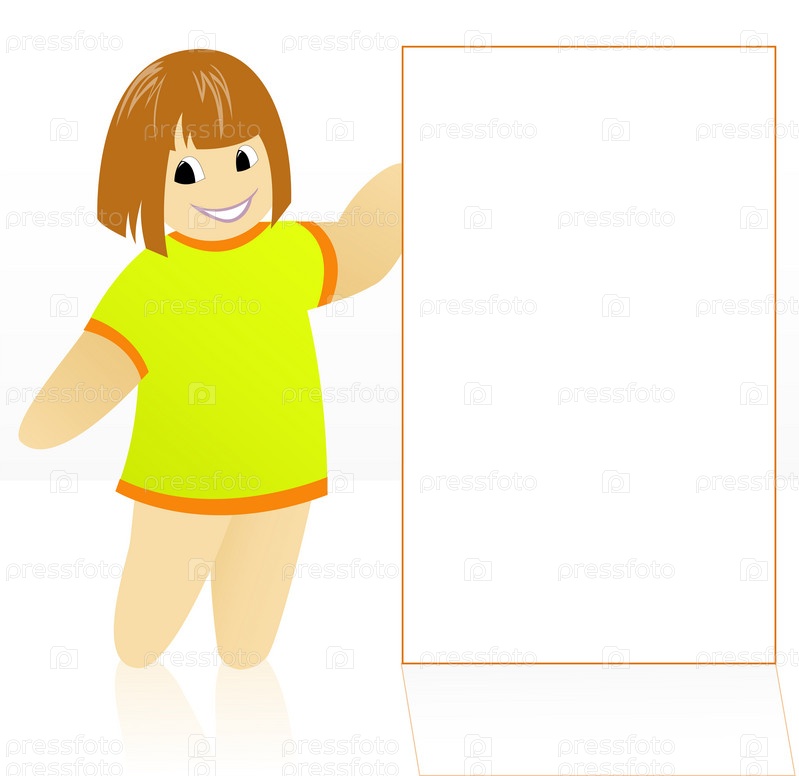 Мультяшная девочка в желтом платье держит большой белый плакат