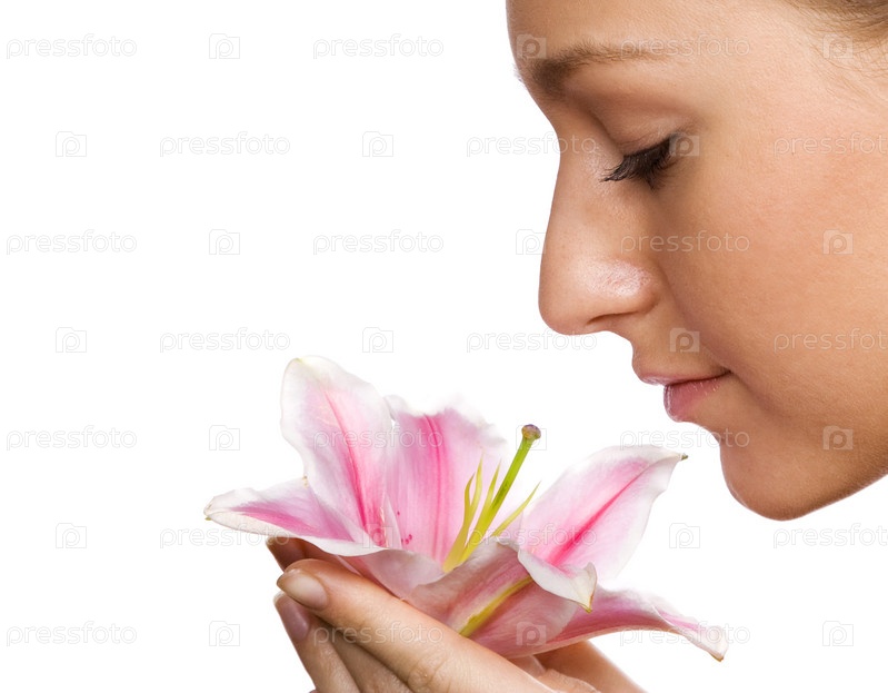 Девушка наслаждается ароматом лилии