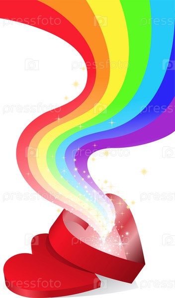 Сверкающая радуга выходит из красной коробки в форме сердца