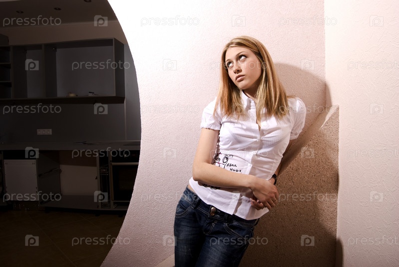 Грустная девушка стоит у стены