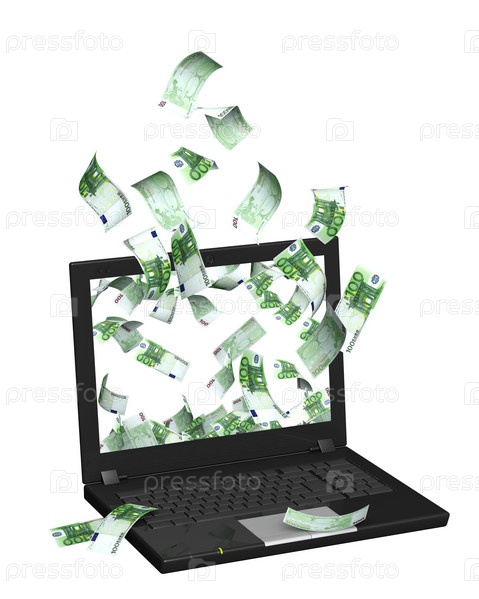 Банкноты евро, вылетающие из экрана ноутбука