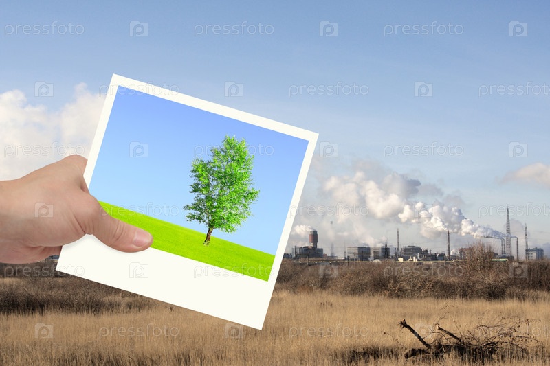 Рука, держащая фотографию с зеленым деревом, на фоне завода