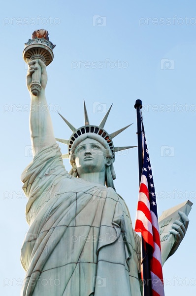 Знаменитая статуя Свободы в Нью-Йорке и американский флаг на фоне голубого неба