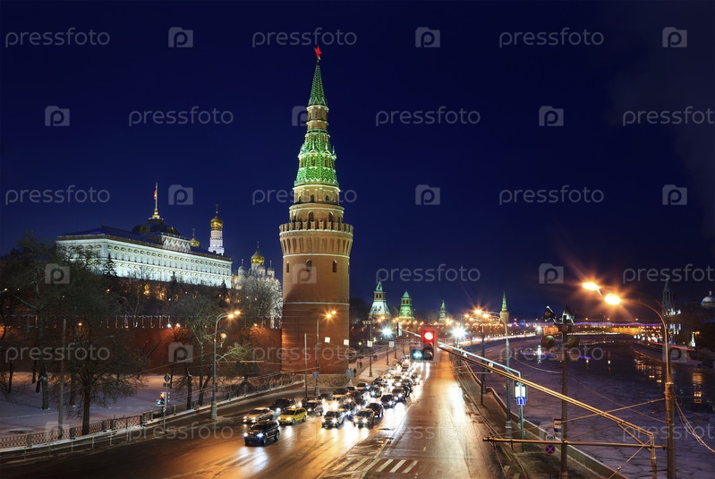 Ночной вид на Водовзводную башню Кремля и Кремлевскую набережную, Москва, Россия