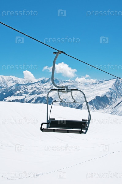 Горнолыжный кресельный подъемник на фоне белоснежных гор и синего неба