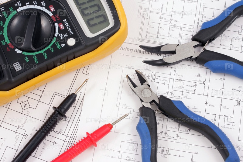 Трехфазный провод, клещи, измерительный прибор, лежащие на чертеже