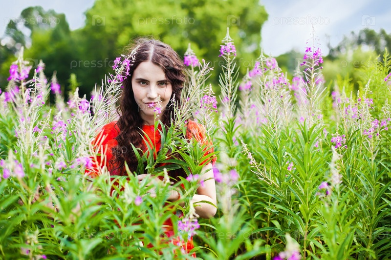 Улыбающаяся девушка в красном платье среди цветов