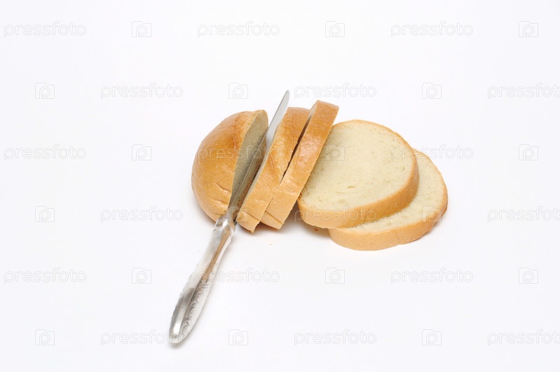 Разрезанный батон и нож изолированы на белом фоне