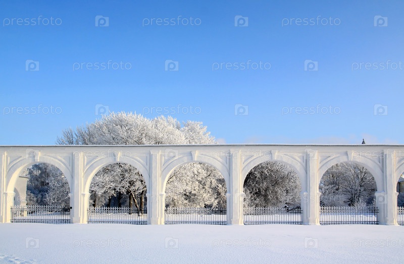 Белая стена из арок на фоне зимнего леса